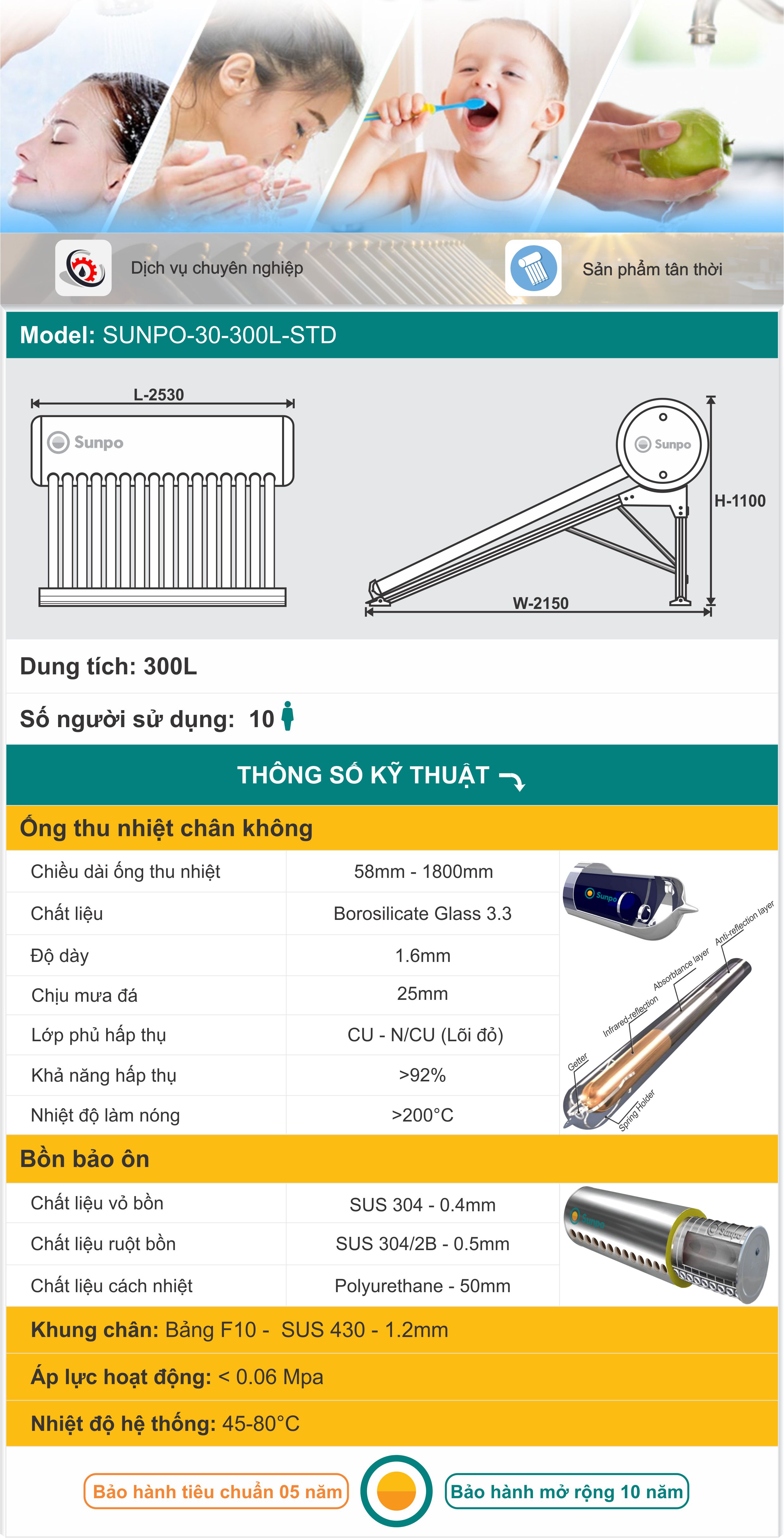 SUNPO-30-300L-STD là một lựa chọn lý tưởng cho người dùng có nhu cầu lớn về nước nóng và muốn sử dụng năng lượng mặt trời để tiết kiệm năng lượng và bảo vệ môi trường.